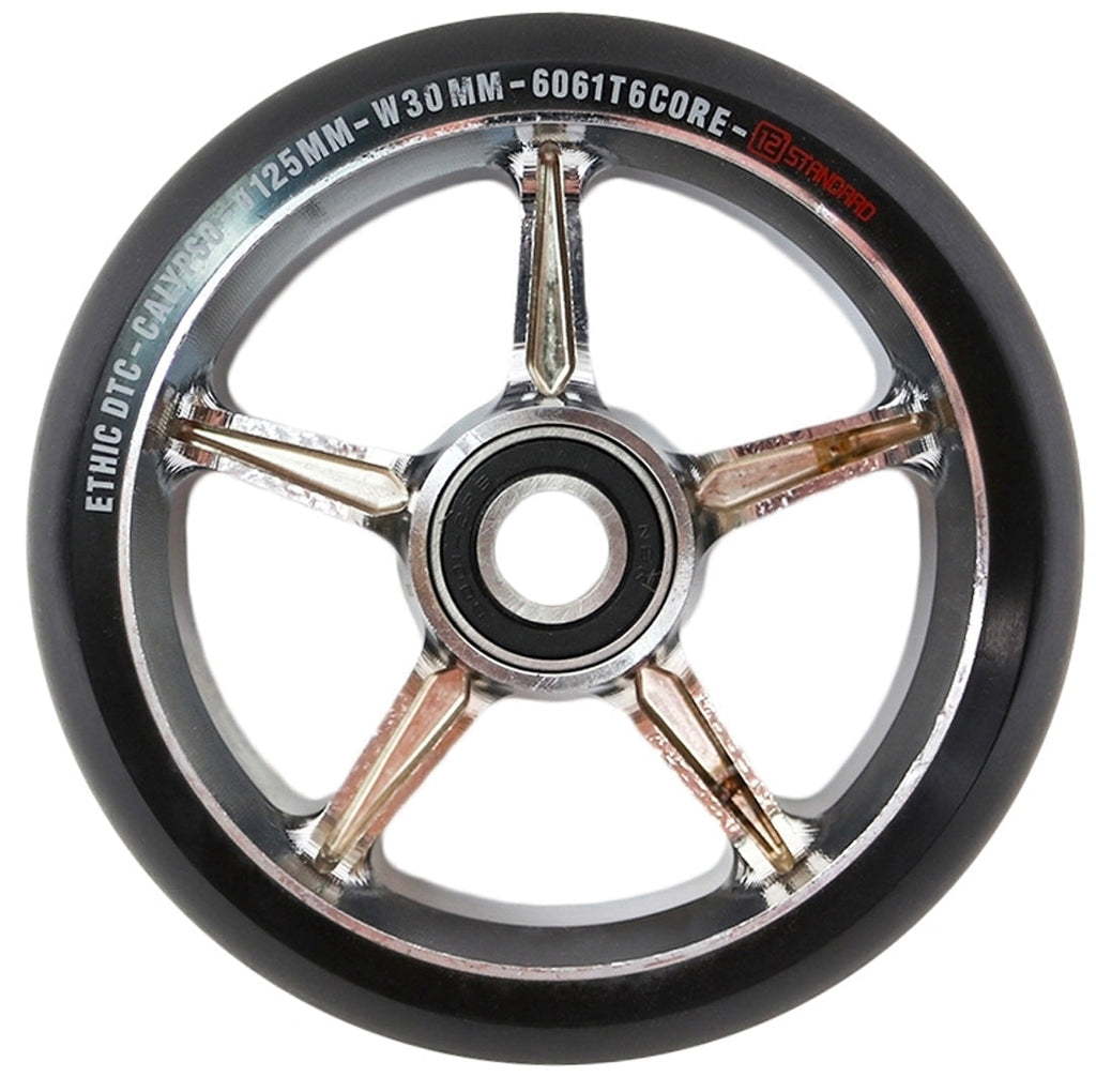 The Ethic Calypso Wheel is 125mm x 30mm in size, making these the largest scooter wheels in the sport. They also come with pre installed 12 STD bearings so you can ride right when you get them. Keep in mind that the wheel and bearings are larger and wider than the usual size so they might not fit on just any scooter. These wheels are only compatible with the Ethic 12 Standard Nemesis Fork and decks that can run the larger 12 STD Axle.